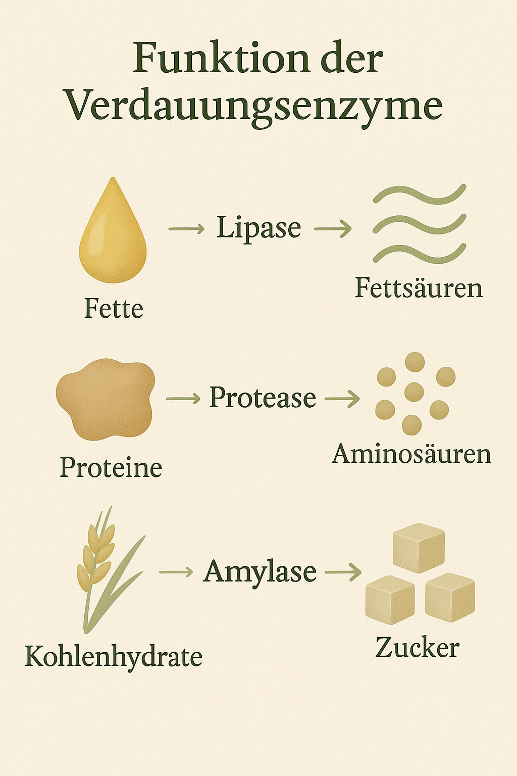 Verdauungsenzyme sind spezielle Proteine, die im Körper wie kleine Helfer wirken: Sie beschleunigen die natürlichen Prozesse, die Nahrungsmittel in ihre Grundbausteine zerlegen und so verwertbar machen – Aminosäuren, Fettsäuren und Zucker. Diese Enzyme werden von verschiedenen Organen, wie der Bauchspeicheldrüse, dem Magen und den Speicheldrüsen, produziert und sind entscheidend für die Nährstoffaufnahme.